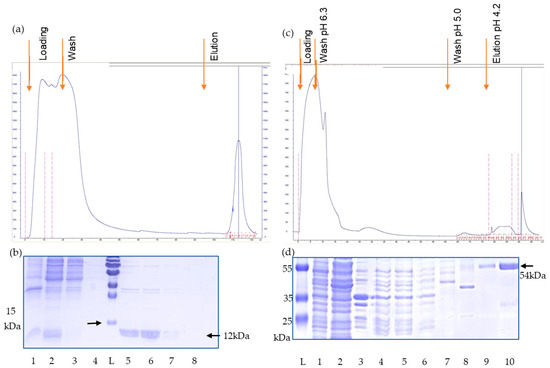 (a) Elution profile of the calmodulin binding protein (CBP) affinity chromatography of recombinant p15E. (b) Coomassie blue staining of SDS-PAGE of fractions of the elution process L, protein ladder, 1, lysed cells, 2, supernatant, 3, flow through, 4, wash fraction, 5–8 elution fractions, i.e., recombinant p15E (12 kDa) protein purified by affinity chromatography. (c) Elution profile of the His tag affinity chromatography of recombinant gp70. (d) Coomassie blue staining of the SDS-PAGE of fractions of the elution process. L, protein ladder, 1, lysed cells, 2, soluble fraction, 3, insoluble fraction, 4, 5, cleared lysate filtered by 0.45µM filter, 6, flow through, 7, wash fraction, pH 6.3, 8, wash fraction at pH 5.0, 9, 10, elution fractions at pH 4.2, i.e., recombinant gp70 (54 kDa) purified by affinity chromatography.