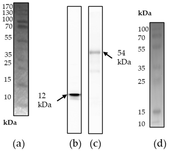 (a) A pre-stained protein ladder was used to indicate the molecular weight of the recombinant p15E. (b) Western blot analysis of recombinant p15E (12 kDa) protein. Goat anti-p15E serum (1:1000) was used as primary antibody, donkey anti-goat IgG antibody (1:20,000) as secondary antibody. (c) Western blot analysis of recombinant gp70 (54 kDa) protein. Goat anti-gp70 serum (1:1000) was used as primary antibody, donkey anti-goat IgG antibody (1:20,000) as secondary antibody. (d) A pre-stained protein ladder was used to indicate the molecular weight of the recombinant gp70.
