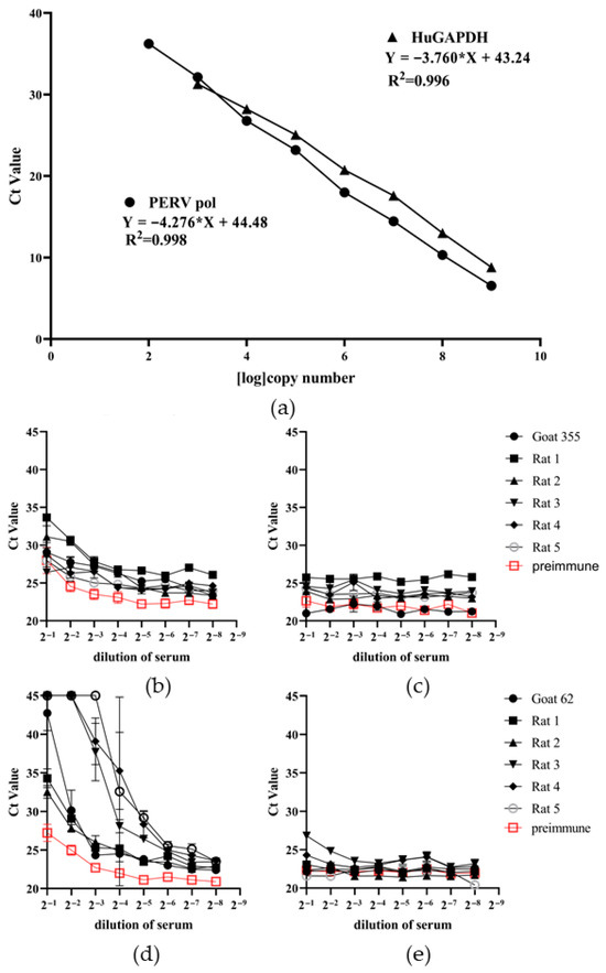 293T cells cultured in DMEM supplemented with heat inactivated 10% FBS at 37 °C in a 5% CO2 incubator were used for neutralization assays. Rat anti-p15E and anti-gp70 sera were heat-inactivated at 56 °C for 30 min and serially diluted two-fold in DMEM. A total of 20 µL undiluted or serially diluted sera and 80 µL PERV supernatant (threshold cycle (Ct) < 25) were mixed and incubated at 37 °C for 15 min. The mixture was added to 100 µL HEK 293T cells (5000 cells/100 µL) in 96-well plates and incubated for 96 h. Lysis duplex real-time polymerase chain (real-time PCR) reaction detecting both, PERV-pol and human glyceraldehyde-3-phosphate dehydrogenase (GAPDH) was performed in situ. Direct PCR Lysis Reagent (Cell) (Viagen Biotech, Los Angeles, CA, USA) and Nuclease-free water were mixed at a 1:1 ratio and Proteinase K (Viagen Biotech, Los Angeles, CA, USA) was added at 800µg per 1 mL of the resulting mixture. This mixture was applied to lyse cells in situ, adding 60 µL per well. The cell lysates were incubated overnight at 55 °C for lysis and wrapped in damp paper towels to prevent evaporation, followed by heat inactivation of proteinase K at 85 °C for 1.5 h. The resulting products were used directly for real-time PCR analysis. Differences among sera were assessed using one-way ANOVA followed by Dunnett’s multiple comparisons test comparing immune rat sera with the normal rat serum. Statistical significance was defined as p < 0.05.