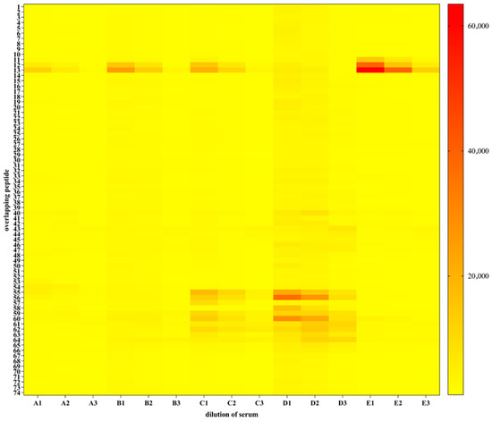 Epitope mapping of five rat sera against p15E. Heatmap diagram showing all sample incubations; y-axis represents peptide sequences in the library (see Supplementary Table S1), x-axis specifies samples applied. The MMC2 values are shown color coded ranging from white (0 or low intensity) via yellow (middle intensity) to red (high intensity). A, rat serum 1; B, rat serum 2; C, rat serum 3; D, rat serum 4; E, rat serum 5. 1, serum dilution 1:40; 2, serum dilution 1:200; 3, serum dilution 1:1000. Strong signals were obtained with control spots containing the full-length rat IgG demonstrating a correct assay performance.