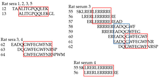 Determination of the epitopes recognized by rat sera 1, 2, 3, 4 and 5. The numbers of the rats and of the peptides are shown and the epitopes are framed. The red boxes indicate major epitopes, the blue box a potential minor epitope.