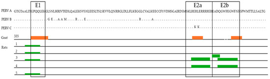 Summary of epitopes recognized by five rat sera (green) and one control goat serum (orange, goat #355) against PERV p15E. The epitopes recognized by goat serum 355 were determined previously using another method, based on a cellulose-adsorbed peptide spot library of 15-mer peptides overlapping by 12 amino acids and detection by chemiluminescence [21].