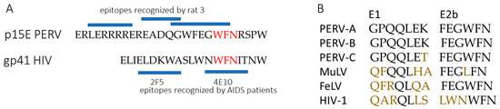 (A) Sequence comparison between the membrane proximal external region (MPER) of the transmembrane envelope protein PERV p15E and HIV-1 gp41. Identical amino acids are marked in red. The epitopes recognized by the immune serum from rat 3 and the epitopes recognized by the monoclonal antibodies 2F5 and 4E10, isolated from AIDS patients [29] are shown as blue bars. (B) Sequence comparison of epitopes E1 and 2Eb of different retroviruses. Non-conserved amino acids are shown in color.