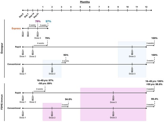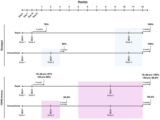 As described, both vaccines can be administered according to Conventional or Rapid schedules [16,17,36]. With Conventional schedules, doses are given at Day 0, 1–3 months, and either 5–12 months for FSME-Immun or 9–12 months for Encepur [16,17] (Table 1). Rapid schedules for either vaccine follow Conventional schedules for both the first and third doses, but the second dose is administered at Day 14 (Table 1). With Encepur’s Express schedule, however, all three priming doses are administered over the course of 21 days (Day 0, Day 7, and Day 21) [16,37] (Table 1).