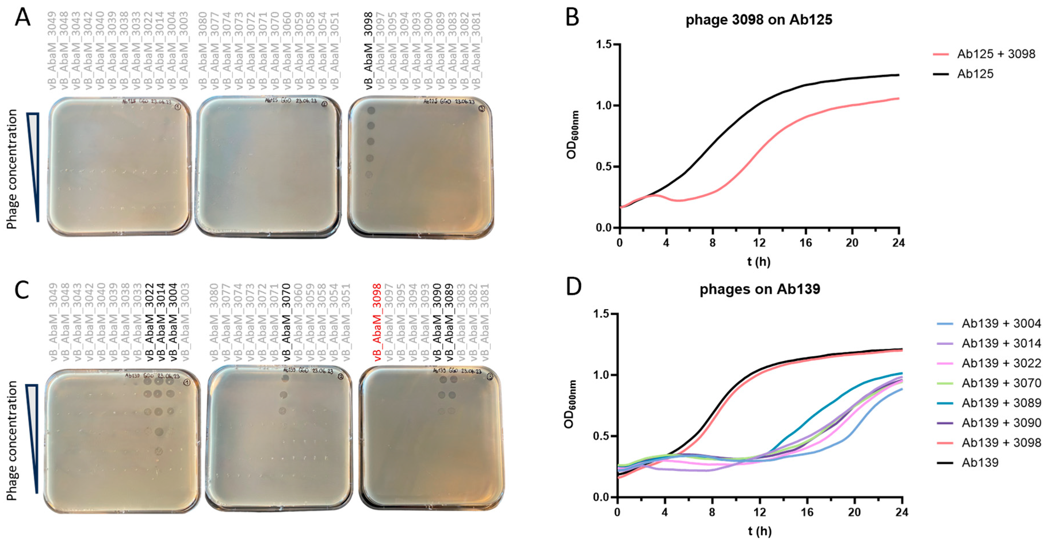 3.1. Ab125 Challenge with Phage 3098 Restored Susceptibility to Different Phages
