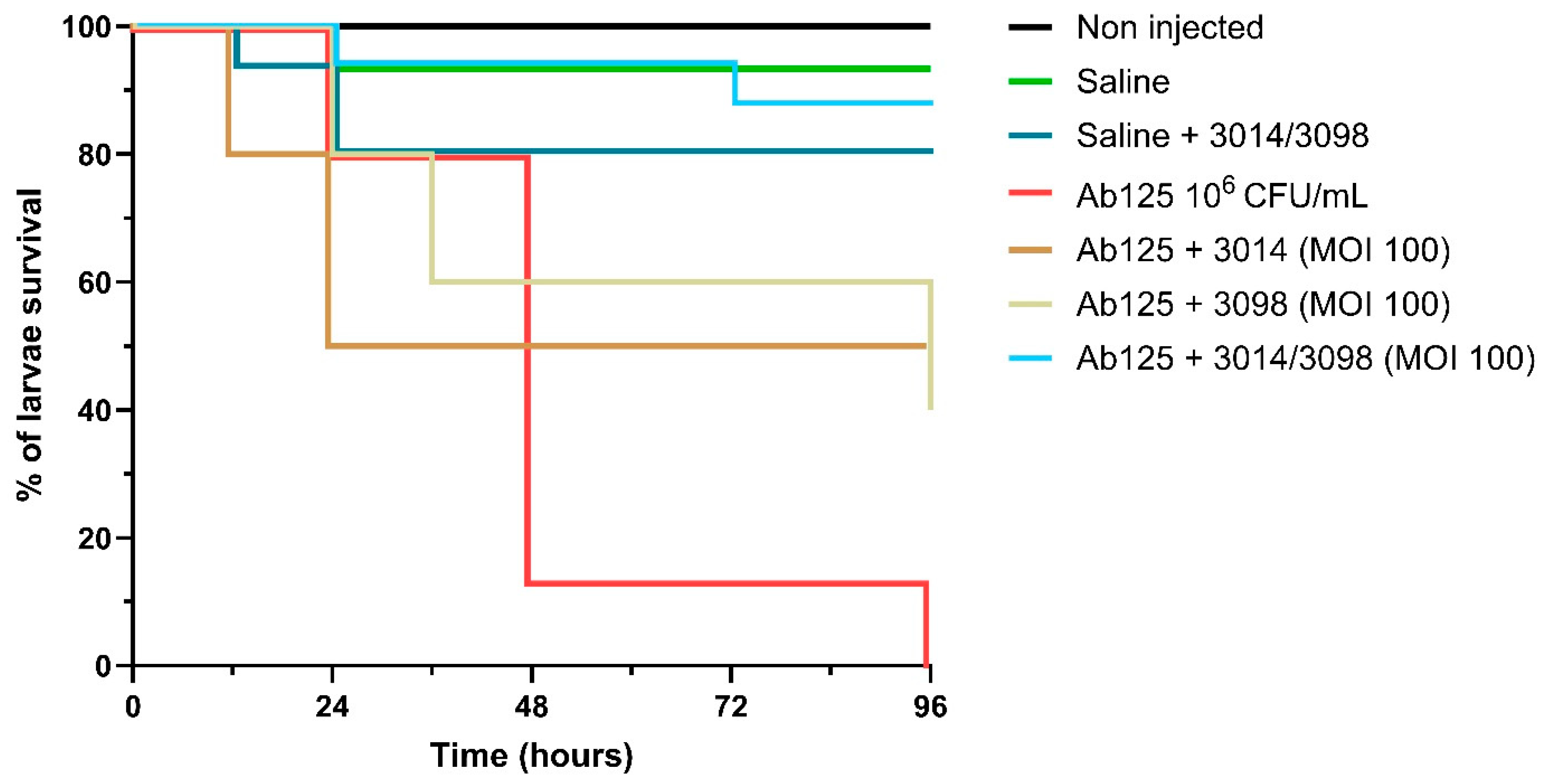 3.5. A Phage Cocktail Composed of Phage 3098 and a “Non-Active” Phage Fully Inhibited the Growth of the Parental Strain Ab125