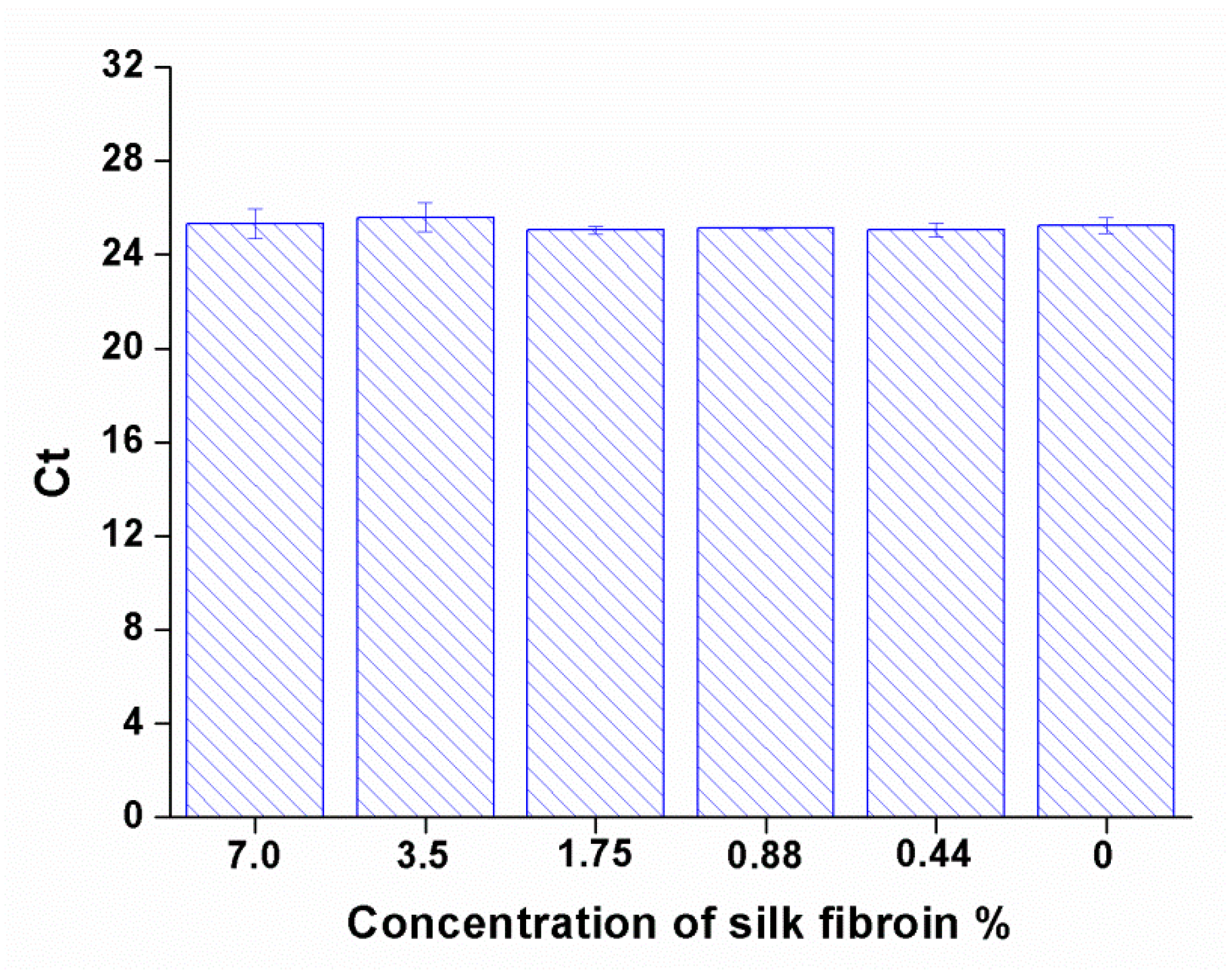 Evaluation of the effect of silk fibroin on Ct values of DENV-1 RNA through RT-qPCR: To assess potential matrix-induced effects of silk fibroin on RT-qPCR quantification, a dilution series of silk fibroin solutions was prepared from 7.0% w/v using a two-fold serial dilution method, yielding concentrations of 7.0%, 3.5%, 1.75%, 0.88%, and 0.44% w/v. Here, a wide range of the silk fibroin concentrations were used to identify the threshold at which silk fibroin might begin to interfere with RT-qPCR. For each concentration, 10 μL of DENV-1 RNA was mixed with 10 μL of the respective silk fibroin solution, resulting in a 1:1 (v/v) RNA-silk matrix. The mixtures were then directly subjected to RT-qPCR analysis without prior processing.