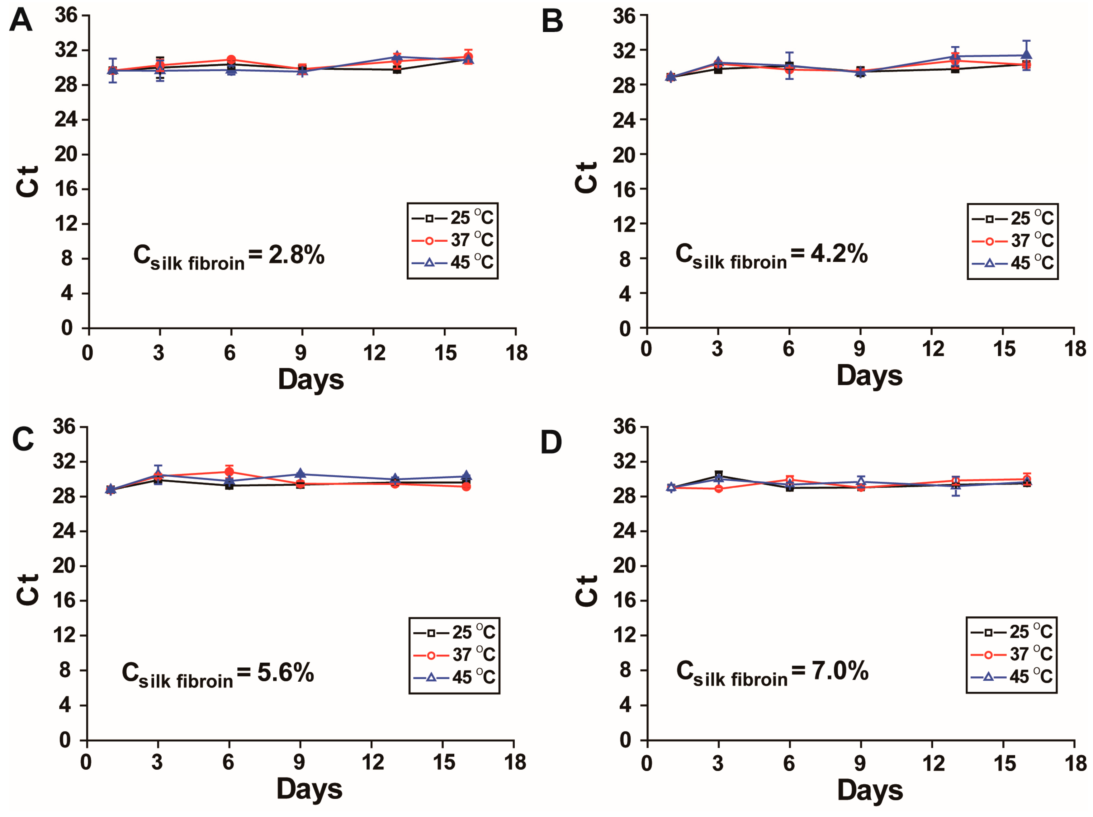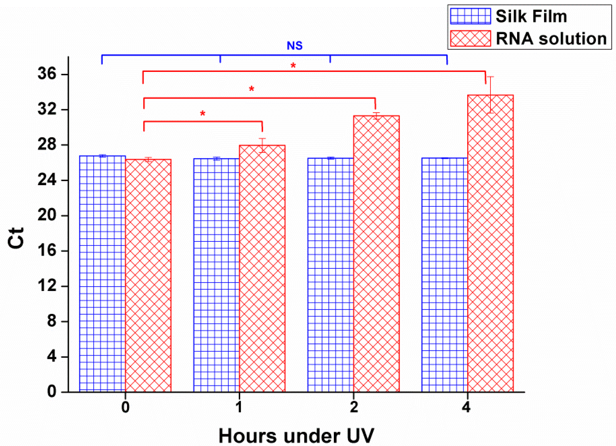 v were shown to interfere with Ct values, although this interference was mitigated by RNA purification. The discrepancy may stem from differences in experimental conditions, including variations in silk fibroin preparation methods, PCR master mix composition, or RNA type. Importantly, in our system, RNA can be directly detected from the dissolved films without prior extraction, enabling a simpler and more user-friendly workflow. Consistent with our findings, RNA in SFFs remained stable at elevated temperatures, including up to 45 °C, further supporting the potential for using RNA-SFFs-based reference materials in extreme or resource-limited environments.
