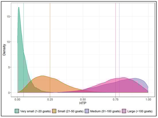 We evaluated the 95% CrI for pairwise differences in HTPs related to each pair of herd size groups. We found that only the CrIs for very small and small herds, and for medium and large herds contained zero. Consequently, regarding HTP, very small and small herds (≤50 goats) and medium and large herds (≥51 goats) may be merged to form two homogeneous groups. The posterior distribution of HTPs by herd size category is shown on Figure 3.