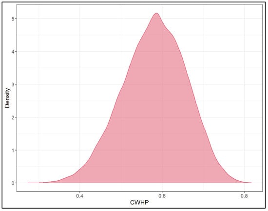 We modelled conditional within herd prevalence (CWHP) applying beta distribution (Figure 4). The posterior mean µ and precision ψ of this distribution was estimated 0.580 (0.423–0.722), and 2.307 (1.110–4.555), respectively. Consequently, the CWHP was 58.0% ± 27.1% (mean ± SD).