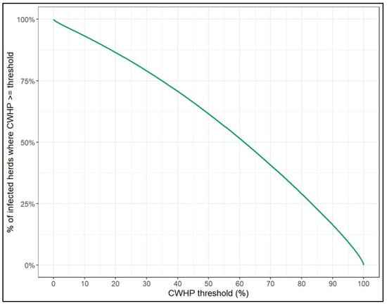 Posterior probability of conditional within herd animal-level prevalence (CWHP) being at least a given threshold.