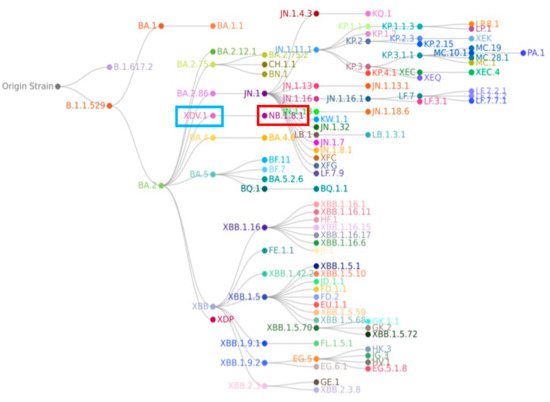 In the phylogenetic tree of the SARS-CoV-2 NB.1.8.1 lineage, the XDV.1 and NB.1.8.1 variants are highlighted in blue and red, respectively. Phylogenetic analysis reveals that NB.1.8.1 is a descendant of the Omicron lineage, but it forms a distinct branch separate from the JN.1 variant and is not a direct descendant of JN.1.