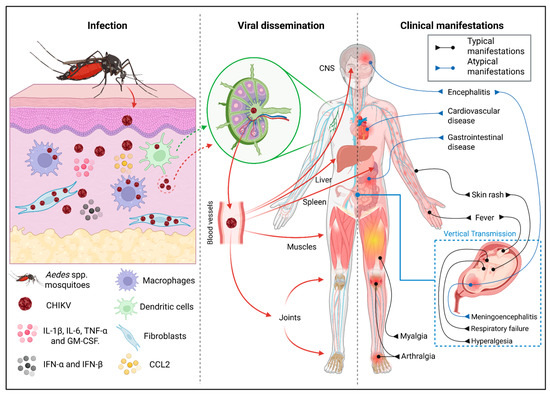 Alphavirus chikungunya, the rename of Chikungunya virus (referred to here as CHIKV) [1], is an arthritogenic arbovirus, belonging to the Togaviridae family and Alphavirus genus and circulating mostly in tropical and subtropical countries; the virus is transmitted to humans by Aedes aegypti (Ae. aegypti) or Aedes albopictus (Ae. albopictus) mosquitoes during blood feeding (Figure 1). CHIKV was first identified in humans in 1952, and the infection is commonly characterized by fever, skin rash, myalgia and intense joint pain [2,3] (Figure 1). Atypical clinical manifestations, such as cardiovascular disease, gastrointestinal involvement and central nervous system (CNS) complications, have also been reported, as well as vertical transmission, which can result in severe neonatal outcomes, including encephalitis and respiratory failure [4,5,6,7] (Figure 1).