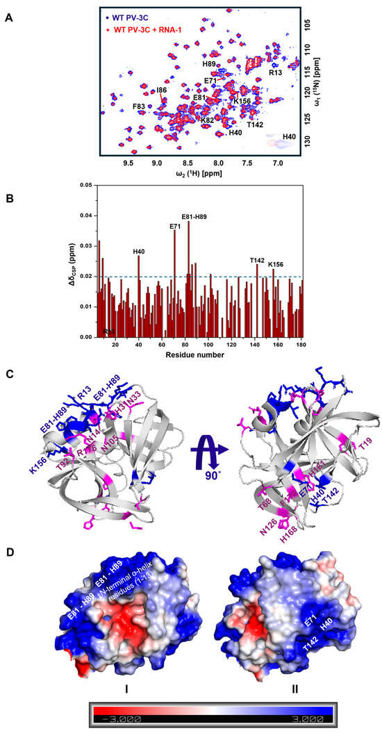 RNA binding leads to chemical shift changes for two oppositely faced residue clusters in PV-3C. (A) 1H-15N SOFAST-HMQC NMR spectra were compared with free wild-type PV-3C (blue) and RNA-1 (GGCGGCGUACUCCGG)-bound PV-3C (red) in 1:0.5 stoichiometry. Residues with substantial chemical shift perturbation (CSP) are labeled in the spectra; zoomed-in resonances represent CSP change for the corresponding residues. (B) NMR CSPs for each residue is plotted, with residues labeled that show a considerable change in CSP after RNA-1 addition. Note that the R13 peak was missing after the addition of RNA-1. NMR CSPs were calculated using the following equation: Δδcombined = (ΔδH2 + (ΔδN/5)2)0.5, where ΔδH and ΔδN are the chemical shift differences between 3C with and without RNA for the backbone amide proton and nitrogen, respectively. Resonances with substantial CSPs have Δδcombined greater than 0.02 ppm (blue dashed line). NMR assignment of 3C is depicted from BioMagResBank database (https://bmrb.io/ (accessed on 28 October 2025)) under BMRB accession number 15222, by Amero CD et al. [14]. (C) Residues showing substantial CSPs in the presence of RNA are represented in blue on the PV-3C X-ray crystal structure (PDB ID: 1L1N). Pink residues represent substantial CSPs in the presence of RNA-3-RNA-15 overall on PV-3C (see Figures S2–S14). The PV-3C protein concentration was 25 µM and RNA was added following a 1:0.5 stoichiometry. Both protein and RNA were in a buffer containing 10 mM HEPES, pH 7.5, and 50 mM NaCl. The 1H-15N SOFAST-HMQC NMR experiment was recorded in a 600 MHz Bruker NEO spectrometer equipped with z-gradient triple-resonance (1H, 13C, 15N) TCI cryogenic probe at 298 K. (D) The electrostatic surface potential map for PV-3C highlights Cluster-I and Cluster-II regions, with blue and red representing positively and negatively charged regions, respectively.