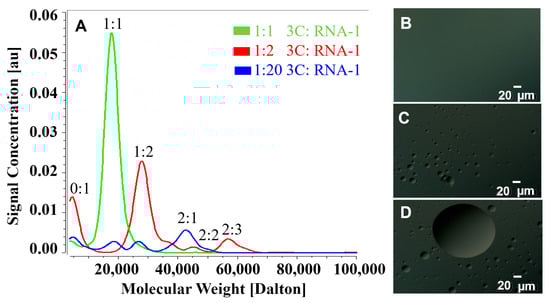 While AUC can detect changes in sedimentation behavior that suggest multimolar ratio complex formation and/or phase separation, it does not provide direct visual confirmation. Differential Interference Contrast (DIC) microscopy has been widely employed to study liquid–liquid phase separation (LLPS) [32,33]. Here, DIC microscopy suggested the formation of microscopic phase-separated droplets owing to RNA addition to 3C, but only under conditions that lead to multimeric complex formation. For instance, the 1:1 3C/RNA-1 complex does not show evidence of phase separation (Figure 2B), unlike those samples using 1:2 and 1:20 3C/RNA-1 ratios (Figure 2C,D, respectively). Further addition of protein or RNA does not affect the process of LLPS. PV-3C or RNA by itself does not lead to the same behavior; notably, 3C is predominantly in its monomeric form up to a 50 µM concentration (Figure S16).