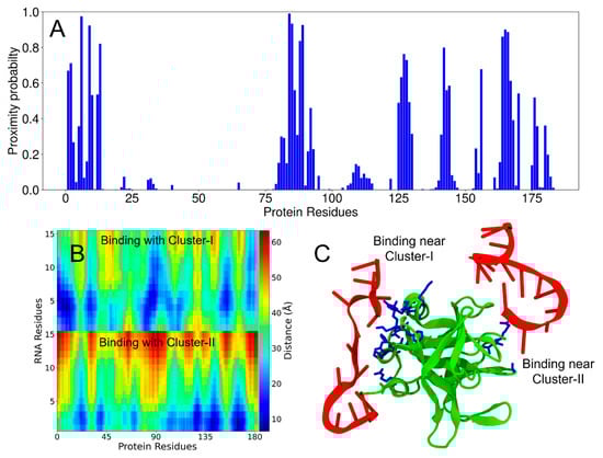 Two interaction sites between PV-3C protein and RNA-1 by MD simulations. (A) Proximity probabilities (Pprox) of residues in 3C. (B) Distance map between the residues of RNA-1 and 3C. The color bar represents the color-coded distances underlying the distance map. The vertical axis shows the RNA residues of the two chains (each with 15 nucleotides). (C) Simulation snapshot showing two chains of RNA-1 interacting with the residues in Cluster-I and Cluster-II of the 3C protein (as also observed from NMR experiments). The protein and RNA chains are shown in green and red, respectively. The residues colored blue have proximity probabilities greater than 0.5.