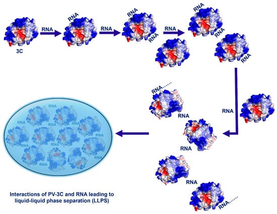 To better define the molecular determinants of RNA interactions with PV-3C and PV-3CD, we assessed the binding of a variety of RNA oligonucleotides with diverse sequences and secondary structure capabilities using a range of experimental and computational methods. While little specificity was found among this set of RNA oligonucleotides, these interactions surprisingly lead to higher-order complex formation and liquid–liquid phase separation (LLPS) for both PV-3C and PV-3CD. LLPS has previously been found in various viral infections, and it may play a role in virally induced apoptosis and virus dissemination through the formation/deformation of stress granules [19,20,21]. As such, these findings provide a potential new role for 3C/3CD in these processes and potentially reveal another level of regulatory processes involving these proteins.