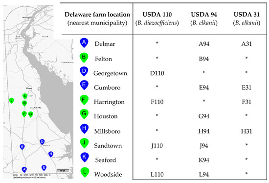 The map on the left portion of the figure shows the locations of 10 soybean fields in Delaware, USA, from which soils were sampled for virulent phage isolation. The pin letter codes correspond to the sample site, and the colors indicate the county in which the site was located (green: Kent County; blue: Sussex County). Matrix (at right) defines the Bradyrhizobium isolation host strain and soil sampling location for each of the 16 virulent bacteriophages, with phage names derived from the letter code of the sampling site followed by a numerical code indicating the Bradyrhizobium strain against which they were isolated. No phages were isolated against seven additional strains tested: B. japonicum strains S06G, K03C, and S04E (all native Delaware strains) or USDA 123; B. diazoefficiens Delaware strains K09F and N03H; B. elkanii strain USDA 46. * No phage was isolated from the soil-strain combination.