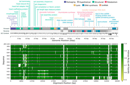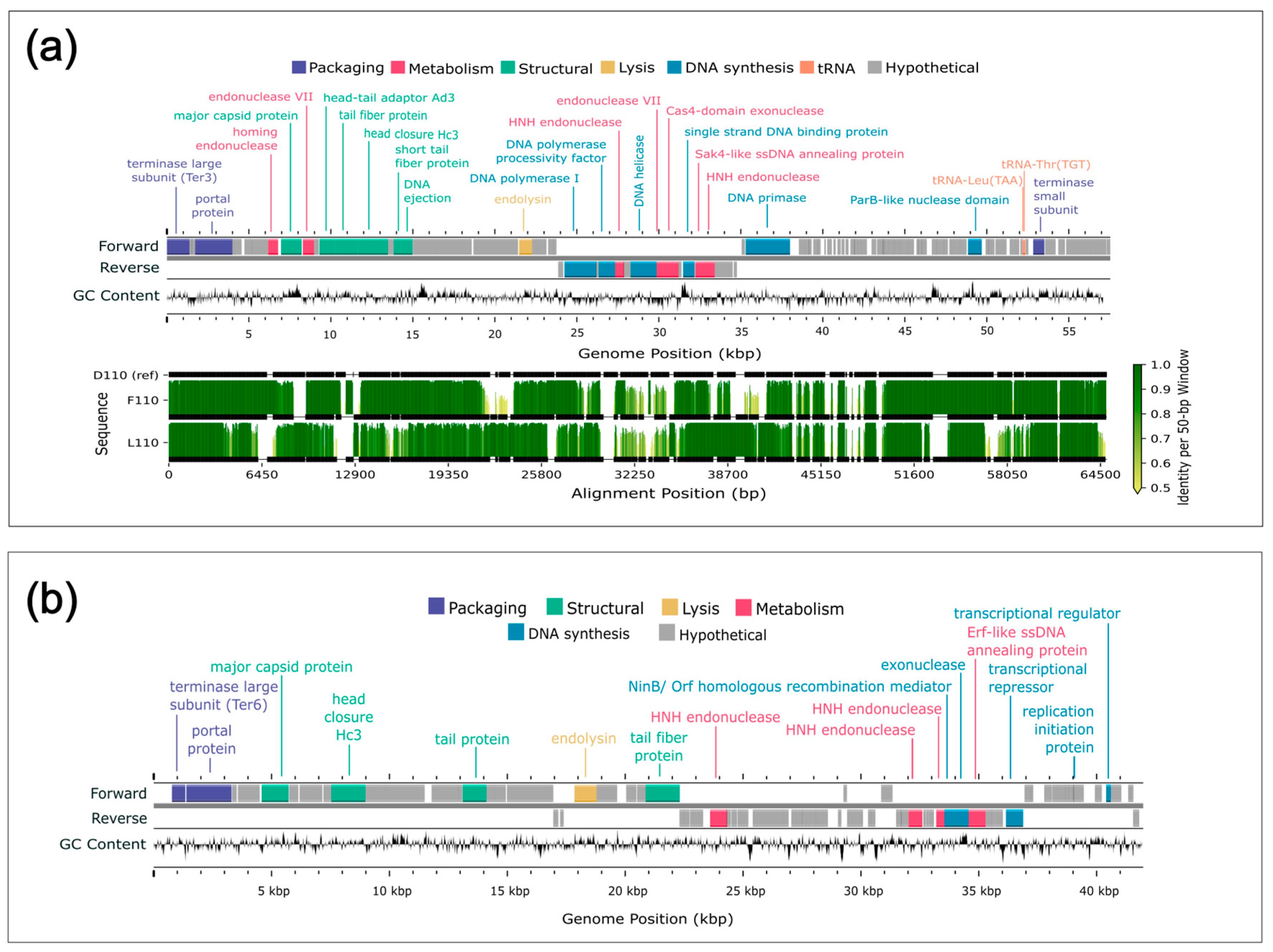 - Das, R.; Rahlff, J. Phage Genome Architecture and GC Content: Structural Genes and Where to Find Them. bioRxiv 2024. [Google Scholar] [CrossRef]