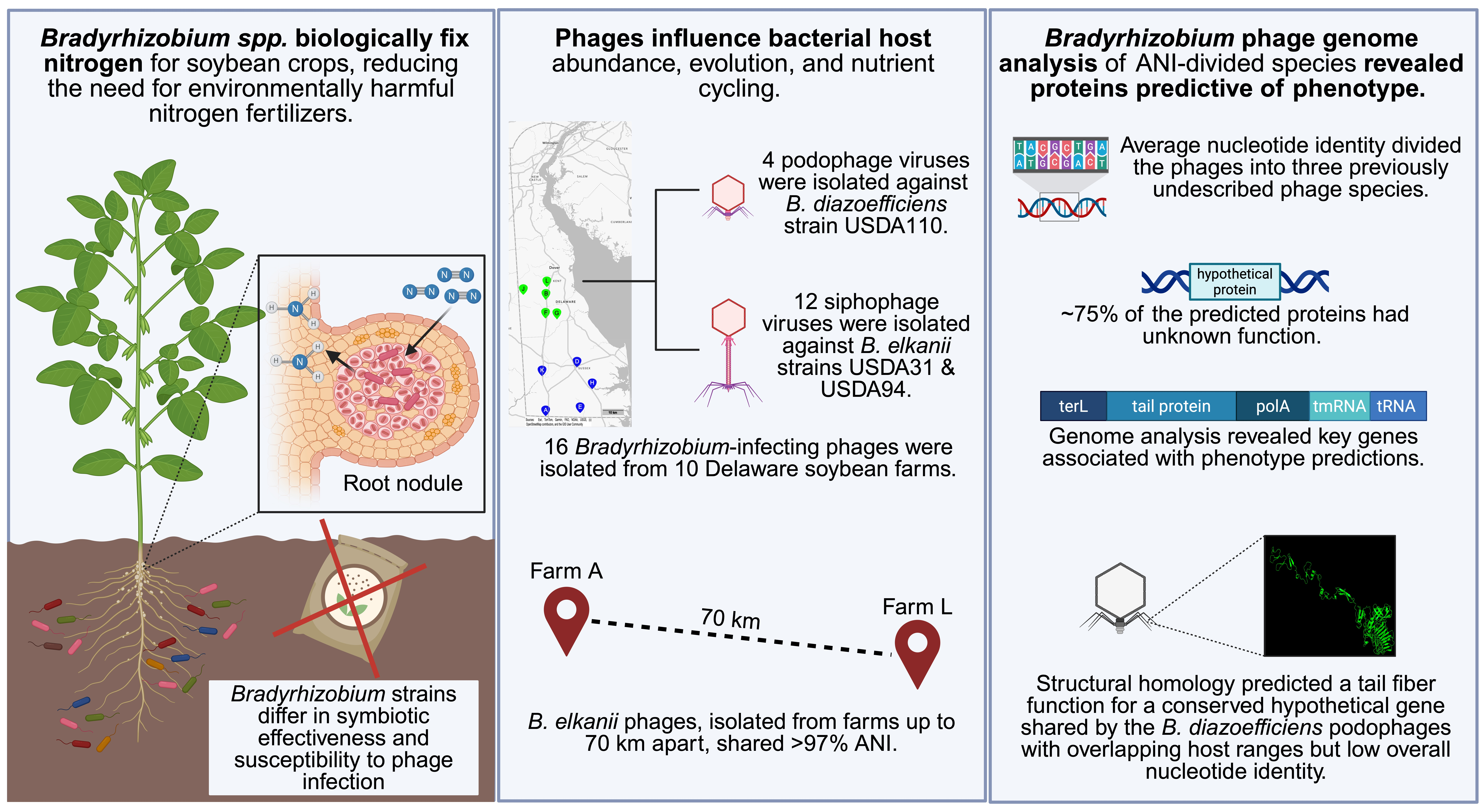 The isolation and characterization of 16 virulent Bradyrhizobium phages from Delaware soybean farms expands our understanding of soil viral diversity and functional potential in agricultural soils. While phages are known to regulate bacterial populations through lysis, horizontal gene transfer, and nutrient cycling [15,16], those infecting soybean-nodulating Bradyrhizobium spp. have remained largely uncharacterized. To our knowledge, this work constitutes the largest addition of Bradyrhizobium phage genomes to date, significantly expanding the genomic resources available for understanding agriculturally relevant soil phages.