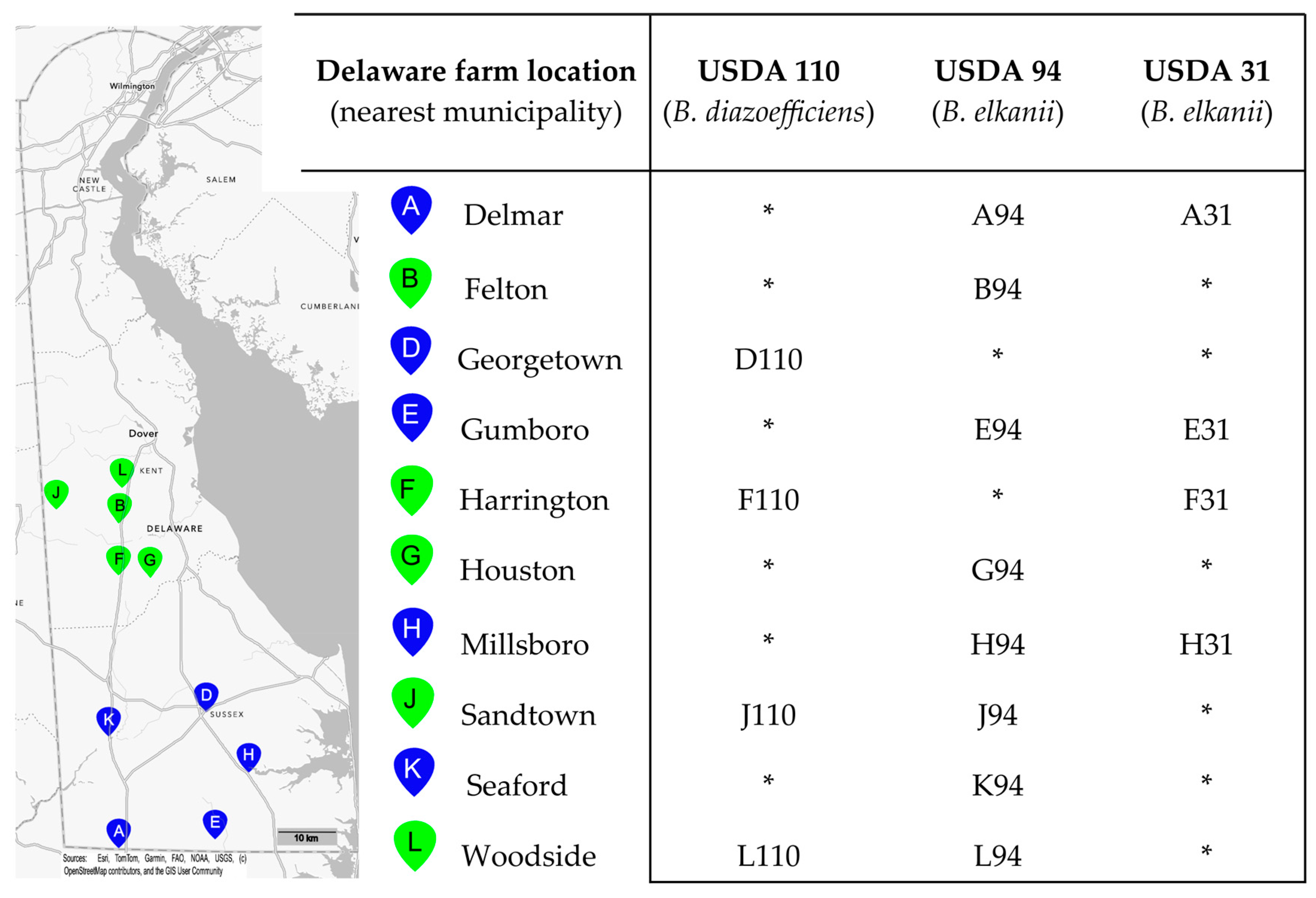 - Fuhrmann, J.J.; Vasilas, B.L. Field Response of the Glycine-bradyrhizobium Symbiosis to Modified Early-Nodule Occupancy. Soil Biol. Biochem. 1993, 25, 1203–1209. [Google Scholar] [CrossRef]