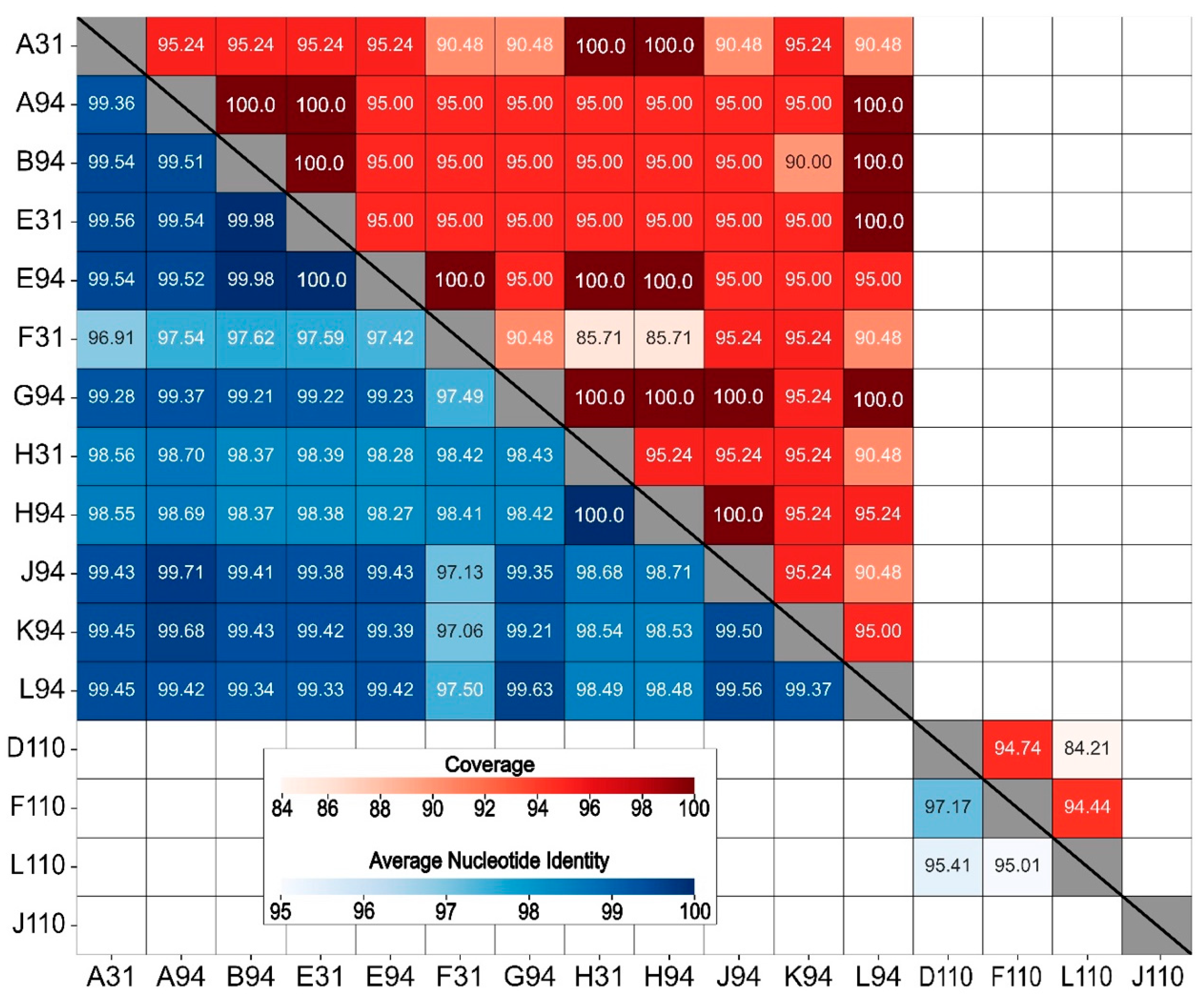 Pairwise average nucleotide identity (ANI) and corresponding genome coverage values were calculated for the 16 genomes using FastANI v1.33 [51]. For each pairing, ANI values, the number of aligned fragments, and the total number of query fragments were recorded. Genome coverage was calculated as: coverage = (aligned fragments/total fragments) × 100. Because FastANI only reports coverage in one direction (query vs. reference), reciprocal comparisons were averaged to compute a symmetric coverage matrix. A combined heatmap of ANI and coverage values were generated using Python v3.12 with the following libraries: pandas v2.2.1, NumPy v1.26.4, seaborn v0.13.2, and matplotlib v3.8.4.