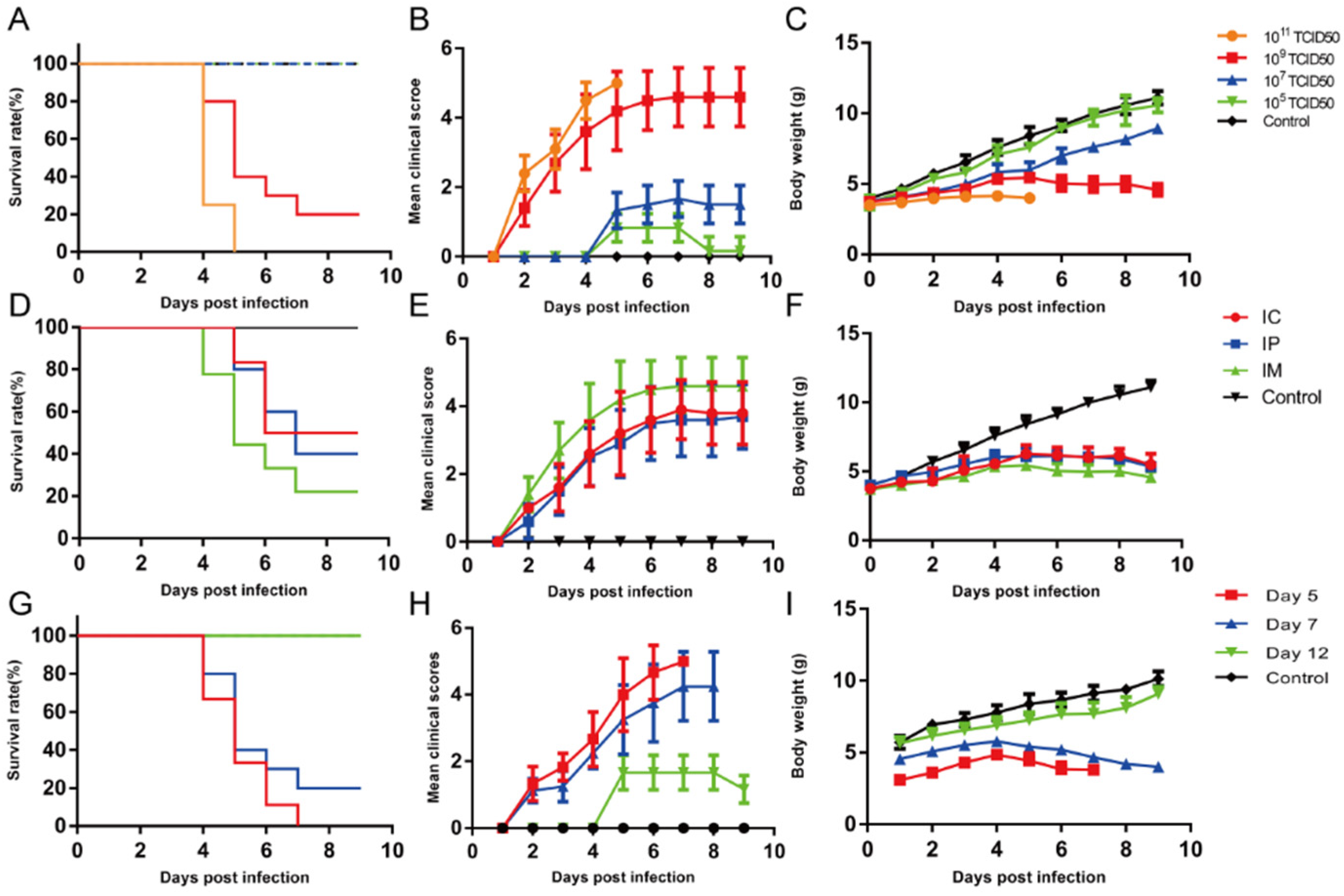 50/mL of virus, 7-day-old mice exhibited weight loss, limb paralysis, and mortality, whereas 12-day-old mice showed milder motor deficits (clinical scores 1–2) without mortality, consistent with the findings of Zhang et al. [