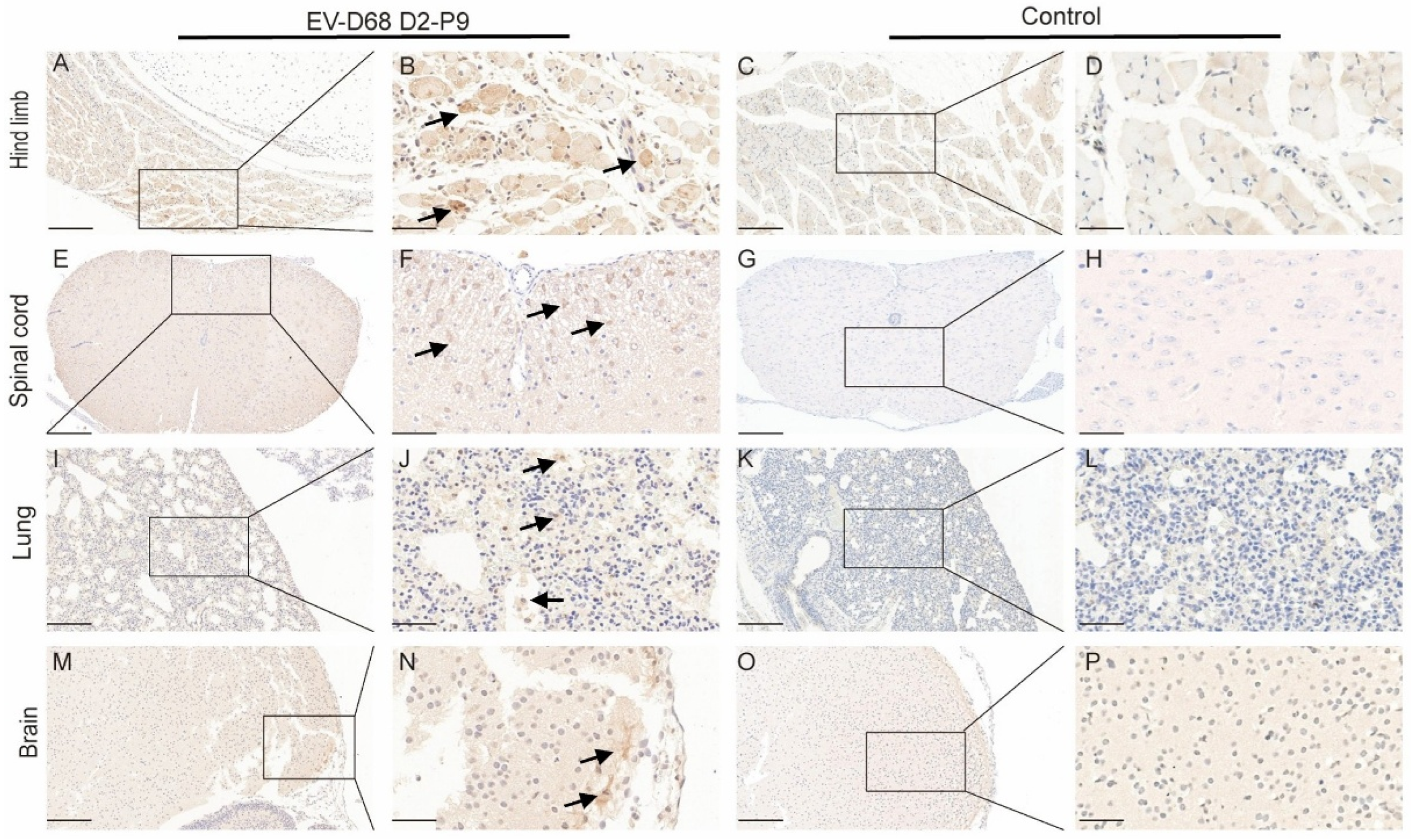 VP1 IHC revealed intense viral presence in spinal cord motor neurons and hindlimb muscle fibers, suggesting that the skeletal muscle is a primary replication site, with potential viral dissemination to the spinal cord via retrograde axonal transport. Limited VP1 staining in brain neurons and lung alveolar epithelial cells indicates tissue-specific tropism, likely influenced by receptor expression and immune responses. We further demonstrated that EV-D68 D2-P9 infection elicits robust immune activation across multiple tissues, characterized by distinct immune cell infiltration patterns in the spleen, spinal cord, and lungs. These results are consistent with previous reports on EV-D68 pathogenesis and host immune responses, such as the findings of Acevedo et al. on IL-52-driven immune cell infiltration [
