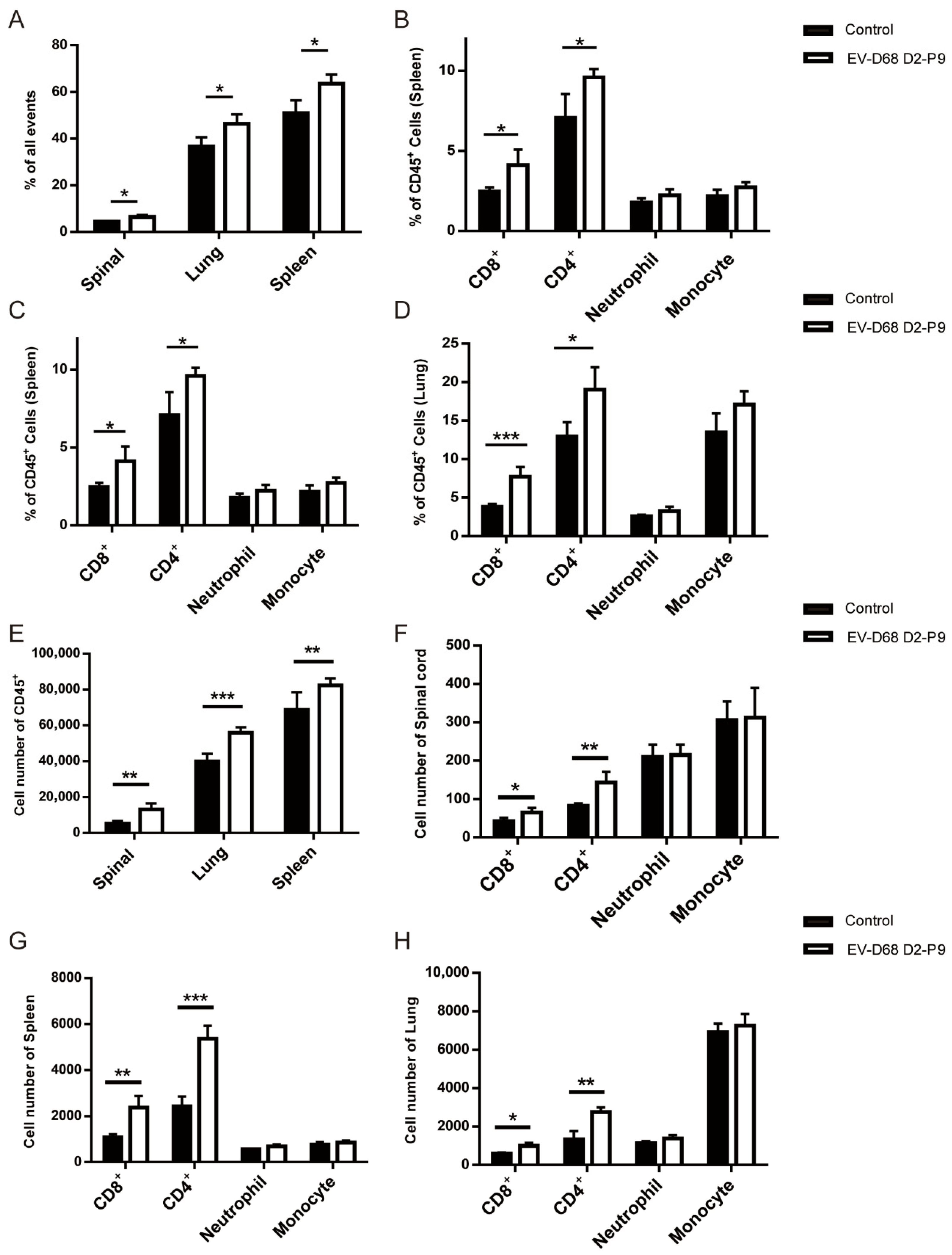 + leukocytes across the examined tissues highlights the systemic nature of the immune response to EV-D68 D2-P9 infection, particularly in immunocompetent hosts [