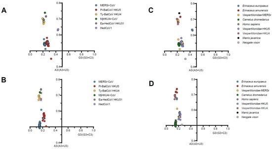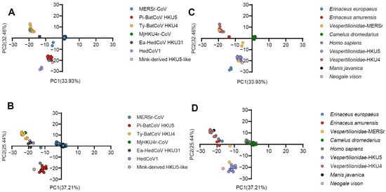 Principal Component Analysis (PCA) based on the RSCU values of 59 synonymous codons. (A,B) represent codon usage patterns of the RdRp and S gene in different Merbecovirus lineages, respectively; (C,D) represent codon usage clustering of the RdRp and S gene in different hosts. MERSr-CoV, Pi-BatCoV HKU5, Ty-BatCoV HKU4, MjHKU4r-CoV, Ea-HedCoV HKU31, HedCoV1, and mink-derived HKU5-like are represented in blue, red, yellow, green, dark gray, purple, and dusty pink. Erinaceus europaeus, Erinaceus amurensis, Vespertilionidae-MERSr, Camelus dromedarius, Homo sapiens, Vespertilionidae-HKU5, Vespertilionidae-HKU4, Manis javanica, and Neogale vison are represented in blue, red, yellow, green, light gray, purple, cameo brown, black, and dusty pink, respectively. Vespertilionidae-MERSr: Vespertilionidae carrying MERSr-CoV; Vespertilionidae-HKU5: Vespertilionidae carrying Pi-BatCoV HKU5; Vespertilionidae-HKU4: Vespertilionidae carrying Ty-BatCoV HKU4.