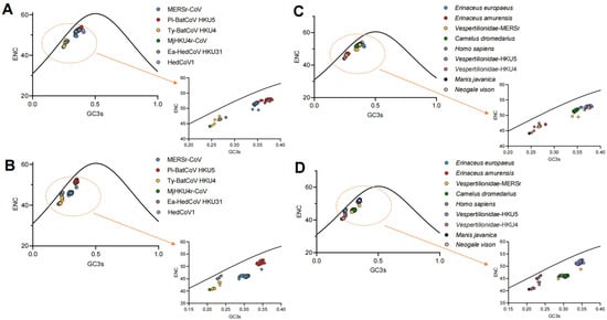 Analysis of codon usage bias using ENC-GC3s plots for the RdRp and S gene. (A,B) represent ENC plotted against GC3s for the RdRp and S gene in different Merbecovirus lineages, respectively; (C,D) represent ENC plotted against GC3s for the RdRp and S gene in different hosts, respectively. Solid curves represent the expected ENC values. Arrows point to the magnified views (right) of the areas marked by the dashed orange circles.
