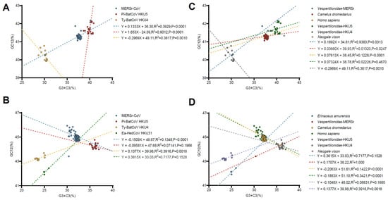 Neutrality plot analysis of codon usage (GC3s against GC12s) for the RdRp and S genes. (A,B) represent neutrality plot for the RdRp and S gene in different Merbecovirus lineages, respectively; (C,D) represent neutrality plot for the RdRp and S gene in different hosts, respectively. GC12s is plotted on the ordinate, and GC3s on the abscissa. The dotted line is the linear regression of GC12s against GC3s.
