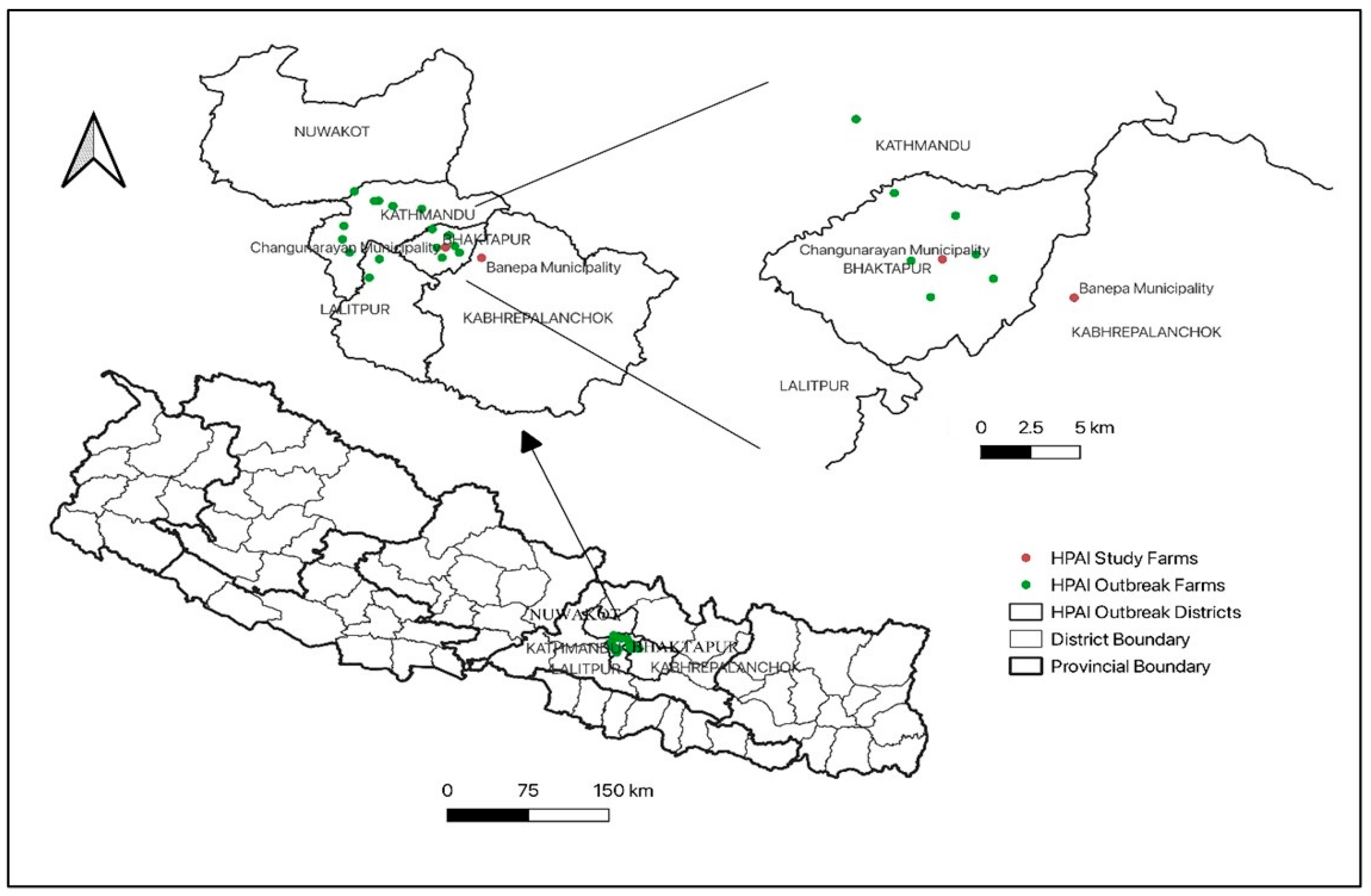In 2023, outbreaks in eighteen commercial poultry farms across five central districts: Kathmandu, Lalitpur, Bhaktapur, Kavrepalanchok, and Nuwakot were reported (