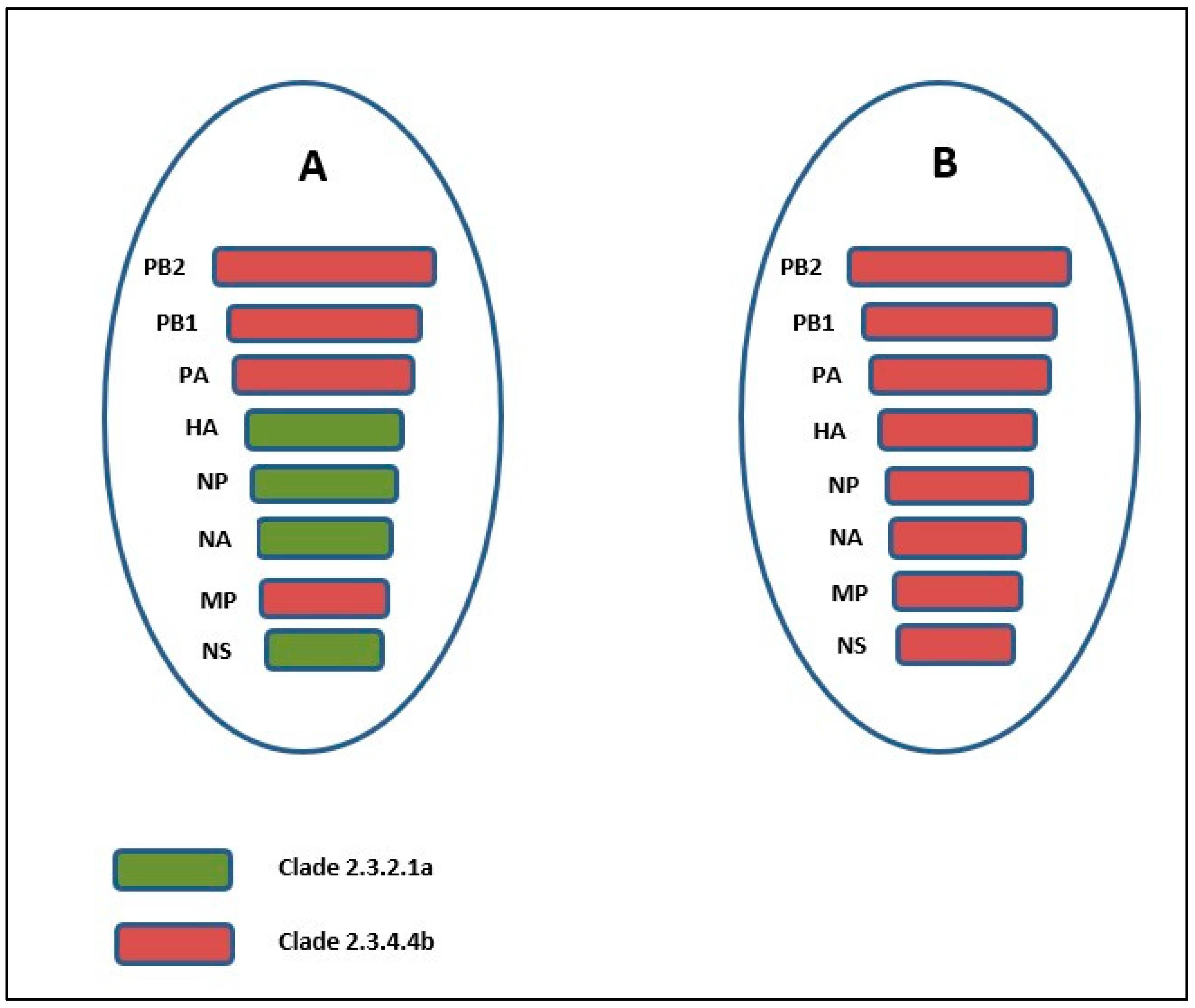 Figure 3) in Nepal for the first time. The clade 2.3.2.1a/2.3.4.4b reassortant virus was highly similar to viruses that have caused recent human fatalities in India, and so, these findings should encourage Nepalese authorities to increase surveillance and molecular characterization of AIVs present in their country. The study should also encourage further studies in order to better understand the impact of circulating avian influenza viruses and their zoonotic potential.