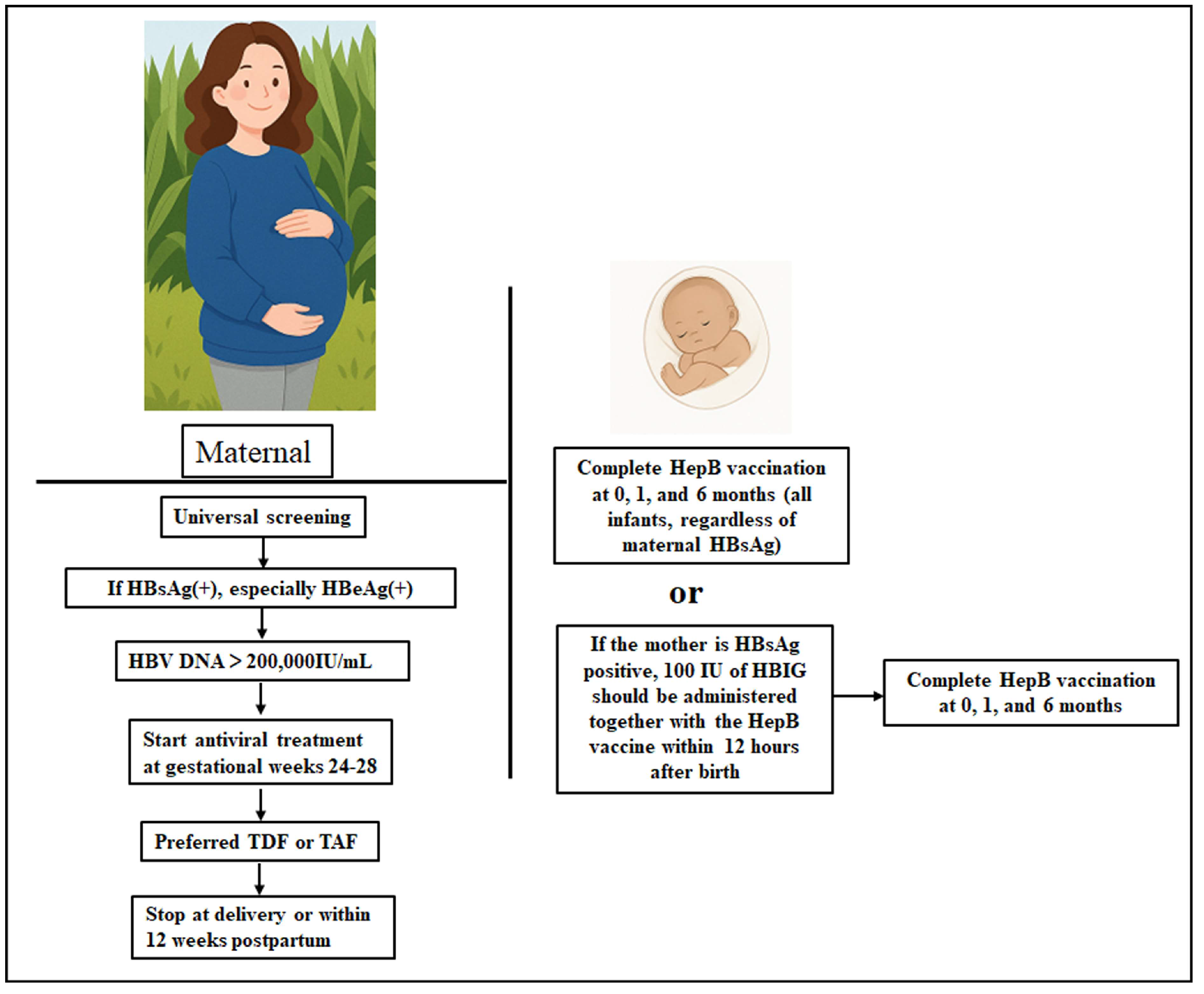 - Zeng, Q.L.; Zhou, Y.H.; Dong, X.P.; Zhang, J.Y.; Li, G.M.; Xu, J.H.; Chen, Z.M.; Song, N.; Zhang, H.X.; Chen, R.Y.; et al. Expected 8-Week Prenatal vs. 12-Week Perinatal Tenofovir Alafenamide Prophylaxis to Prevent Mother-to-Child Transmission of Hepatitis B Virus: A Multicenter, Prospective, Open-Label, Randomized Controlled Trial. Am. J. Gastroenterol. 2025, 120, 1045–1056. [Google Scholar] [CrossRef]