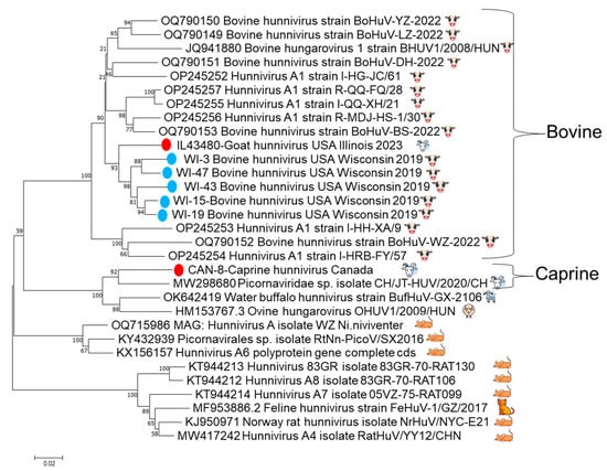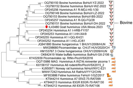 The final genome assembly for the full-genome sequence of this goat hunnivirus strain IL43480 was 7441 nt in length and deposited in GenBank. The GenBank accession number for the sequence is PV935296. BLASTn comparison of the goat hunnivirus strain IL43480 genome showed 83–84% identity to complete hunnivirus genomes, with the highest identity shared with the bovine hunnivirus strain BoHuV-YU-2002 (OQ790150.1) []. Phylogenetic analysis of hunnivirus genomes further confirmed that this strain clustered more closely with bovine strains than with published caprine, ovine, and water buffalo strains (Figure 1).