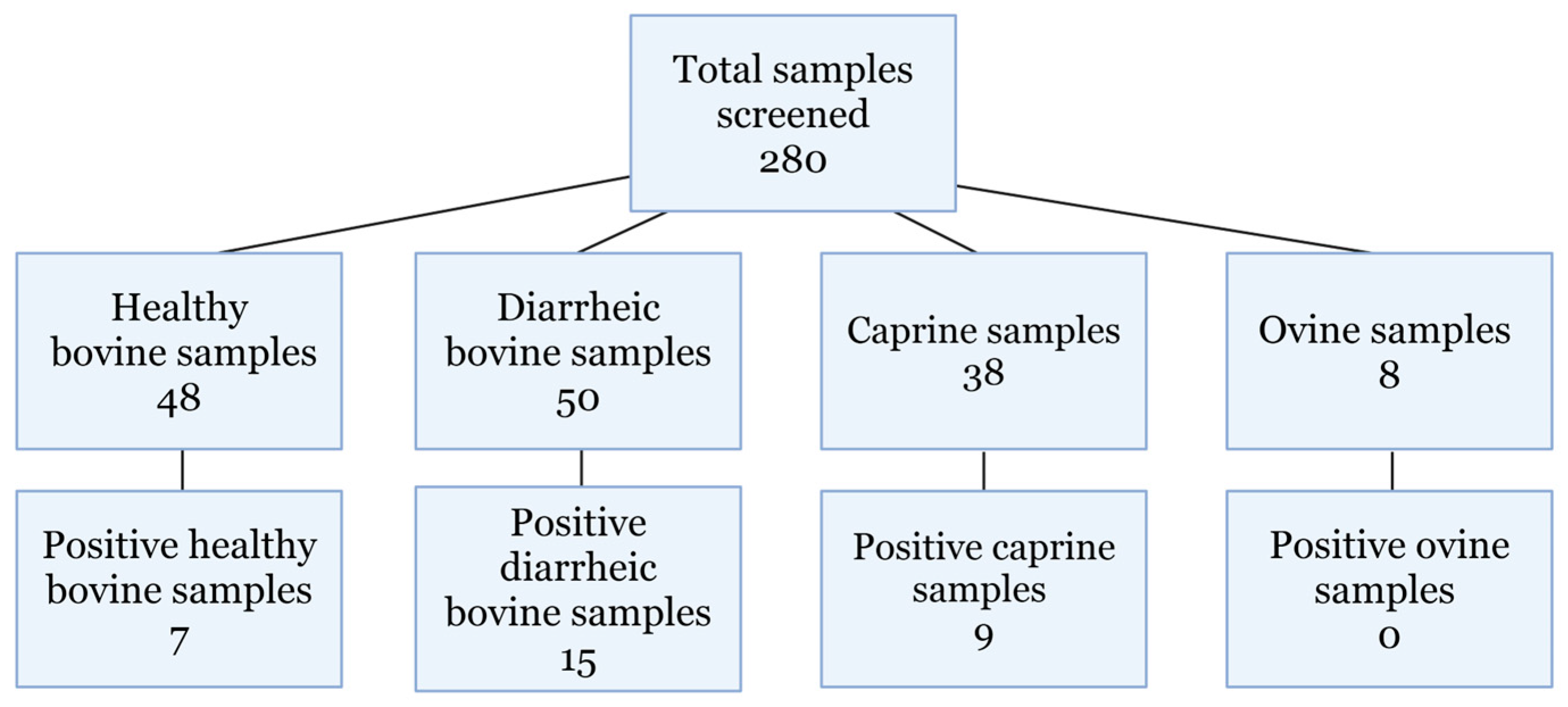 - Karayel-Hacioglu, I.; Duran-Yelken, S.; Alkan, F. Molecular Detection of Picornaviruses in Diarrheic Small Ruminants at a Glance: Enterovirus, Hunnivirus, and Kobuvirus in Türkiye. Kafkas Univ. Vet. Fak. Derg. 2022, 28, 499–506. [Google Scholar] [CrossRef]