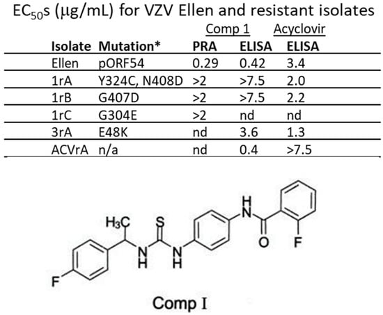 EC50s for VZV Ellen and resistant isolates. The initial resistant isolates were all derived from repeated passage of VZV strain Ellen-infected cells in the presence of increasing concentrations of Comp I. Mutations conferring resistance were mapped to pORF54. The amino acid changes and residue numbers are indicated for each isolate. All resistant isolates had EC50s ~5–20-fold greater than parental VZV Ellen. * Amino acid change in pORF54; n/a—not applicable; nd—not done; 2 μg/mL—maximum concentration of drug tested in plaque reduction assay (PRA); 7.5 μg/mL—maximum concentration of drug tested in ELISA; Comp I—2-Fluoro-N-(4-(3-[1-(4-fluoro-phenyl)-ethyl]-thioureido)-phenyl)-benzamide (structure shown) [33,35].