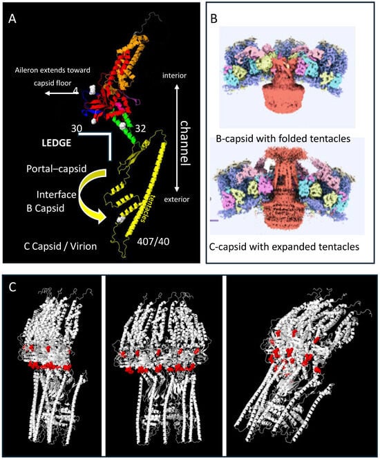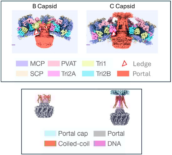 Interactions at the portal—capsid interface. Structure of the VZV portal in B and C capsids (adapted with permission from Cao L. et al. [61]). The top panel shows the portal in the context of the capsid proteins. The bottom panel shows the portal with the capsid proteins stripped away. The portal clip/tentacle region is thought to be folded down toward the portal stem in the B capsid. Upon DNA packaging the coiled-coil regions of the portal extend outward through the capsid protein layers where they eventually interact with the portal cap. The portal in its entirety moves outward and the ledge moves into proximity with one or more of the capsid proteins. The red and white triangle (top panel) depicts the location of the “portal ledge” at the interface of the portal oligomer and the capsid floor. The triangle represents the projected location of the VZV pORF54 resistance mutations at amino acids 48, 304, and 324. Key: MCP—major capsid protein; PVAT—portal vertex associate tegument complex; Tri1, 2A, and 2B—capsid triplex proteins; SCP—small capsid protein.