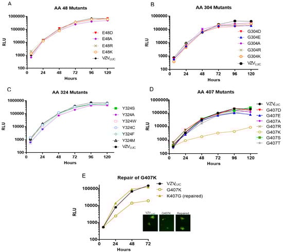 Replication kinetics of VZVLUC, 48, 304, 324, and 407 recombinants. ARPE-19 cell monolayers in 12-well plates were infected with ~300 PFU of cell-associated VZVLUC or each recombinant virus. Three wells per time point were harvested in luciferase lysis buffer and viral replication was measured by firefly luciferase activity shown as relative luminescent units (RLU). Error bars representing the standard error of the mean (SEM) were consistently small and not visible on the log scale, underscoring the high reliability and reproducibility of the luciferase-based replication assay. Viruses were grouped by their resistance locus: (A) amino acid 48 mutants, (B) amino acid 304 mutants, (C) amino acid 324 mutants, and (D) amino acids 407 mutants. Panel (E) compares the replication phenotype of the crippled G407K recombinant to VZVLUC and a repaired virus (K407G). The inset shows representative plaque phenotypes for the three viruses.