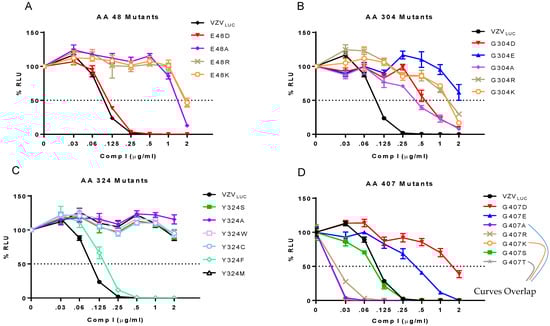 Yield reduction assays for VZVLUC, 48, 304, 324, and 407 recombinants. ARPE-19 cell monolayers in 12-well plates were infected with ~300 pfu of cell-associated VZVLUC or each recombinant virus and incubated with increasing concentrations of Comp I. After 5 d, three wells per drug concentration were harvested in luciferase lysis buffer and analyzed for firefly luciferase activity. Each point represents the average of three wells (± SEM) converted to % relative luminescent units (% RLU) compared to a value of 100% corresponding to each virus in the absence of Comp I (0). Viruses were grouped by their resistance locus: (A) amino acid 48 mutants, (B) amino acid 304 mutants, (C) amino acid 324 mutants, and (D) amino acids 407 mutants.
