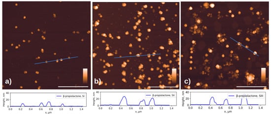 The size distribution of bound particles changed significantly (Figure 6). As expected, intact capsids 28 nm in height were primarily bound to the specific surface. However, in the case of inactivation with formaldehyde and accelerated electrons, a significant number of fragments measuring 10–20 nm in height were present. Their proportion was 38 ± 2% and 17 ± 2% for inactivation with accelerated electrons and formaldehyde, respectively. The proportion of bound fragments during inactivation with β-propiolactone was less than 1%.