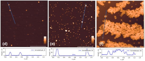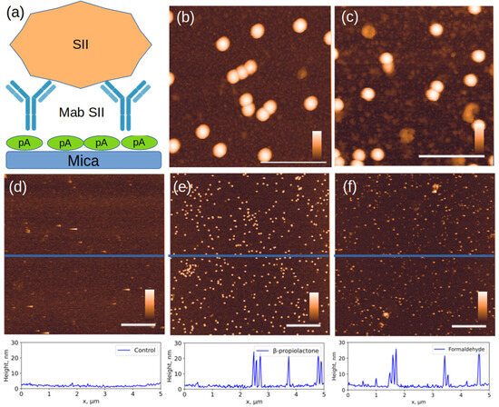 AFM images of objects specifically bound to Mab to the SII strain. (a) experimental scheme, (b,e) SII strain inactivated with β-propiolactone; (c) SII strain inactivated with formaldehyde; (f) SII strain inactivated with accelerated electrons, (d) control sample: inactivated SI on the same Mab SII surface. The section profiles drawn along the blue lines in the corresponding images above are shown at the bottom of the figure. The white scale bar in the images in (d–f) is 1 µm; in (b,c), 150 nm. The color scale bar is from 0 to 30 nm. Additional AFM images available in Supplementary S2.