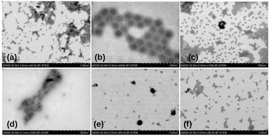 A drop of 5 µg of the initial solution was applied to a clean hydrophobic surface of a plastic Petri dish. A 3 mm copper grid with a carbon coating (with the carbon film facing the drop) was placed on top of the drop. After holding for 10 min, the grid was washed in distilled water, and the remaining liquid was absorbed with blotting paper. The EM grid was then placed in a vacuum for 2–3 days at a pressure of 5 × 10−4 Pa in a Gatan Model 655 setup. Subsequently, the sample was placed in a Hitachi S-5500 scanning electron microscope (Hitachi, Tokyo, Japan) for viewing. Imaging was performed in the transmission mode (BF-STEM).
