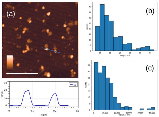 AFM images of viral particles after inactivation with accelerated electrons. (a) Typical AFM image of Sabin 2 virus particles and below the cross-section profile drawn along the blue lines; (b,c) histograms of the height and volume distribution. The white scale bar in the AFM image is 1 μm, and the color scale is from 0 to 30 nm.