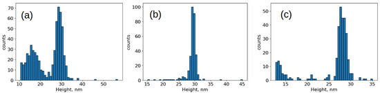 Histograms of the distribution of object heights on a specific substrate. SII strain inactivated by: (a) accelerated electrons, (b) β-propiolactone, (c) formaldehyde.