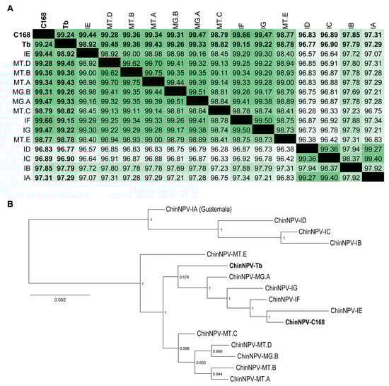 Pairwise nucleotide identity analysis based on full-genome alignment using the MAFFT revealed that C168 showed the highest identity (99.4%) with ChinNPV-IE, indicating it as the closest relative (Figure 1A). Importantly, ChinNPV-IE (the genome used to assembly the novel isolates) was collected in the city of Iguaraçu, Paraná State (Brazil), in January 2007, while the C168 isolate was collected in the same city in December 2013, suggesting a common ancestry of circulant virus population, both as natural epizootic infections. On the other hand, the Tb isolate was most similar to ChinNPV-MG.A (99.33% identity), which was collected in Buritis, Minas Gerais State in February 2014. Also, Tb was found to be closely related to isolates ChinNPV-IG, -IF, -IE, and C168 (Figure 1A). The Tb isolate was collected in a rural area near the city of Planaltina, Federal District (Brazil), which is geographically closer to the city of Buritis, Minas Gerais, where the isolates -MG.A and -MG.B were found.