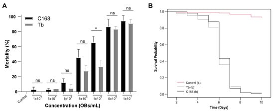 Concentration-response and survival of ChinNPV isolates CNPSo-168 (C168) and Tabatinga (Tb) in 2nd- to 3rd-instar C. includens larvae. (A) Lethal concentration assay. No virus-like symptoms were observed in the negative control, and asymptomatic mortality remained below 2.5%. A significant difference between isolates was detected only at 1.00 × 106 OBs/mL (t-test, p < 0.001, *). (B) Survival curves for larvae infected with C168, Tb, or untreated control. No virus-related mortality was observed in the control group, and asymptomatic deaths did not exceed 2%. Survival differed significantly among treatments (log-rank test, p < 0.001). Letters in parentheses indicate significant differences between treatments; ns = not significant.