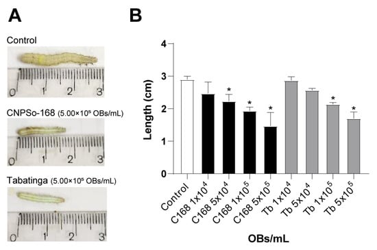 To assess the sublethal effects of ChinNPV infection on host development, we measured larval growth under different viral concentrations. Larvae from the virus-free control group reached an average length of 2.9 ± 0.1 cm (Figure 3A). In contrast, larvae exposed to the C168 and Tb isolates showed concentration-dependent growth inhibition and concentrations higher than 5.00 × 104 OBs/mL for C168 and 1.00 × 105 OBs/mL for Tb differed from untreated larvae (χ2 = 2.71; df = 8; p < 0.001) (Figure 3B). For C168, average larval length decreased progressively with increasing viral concentration (from 2.47 ± 0.35 cm at 1.00 × 104 OBs/mL to 1.47 ± 0.42 cm at 5.00 × 105 OBs/mL), similarly to that observed for Tb-treated larvae (from 2.87 ± 0.12 cm at 1.00 × 104 OBs/mL to 1.70 ± 0.20 cm at 5.00 × 105 OBs/mL). Notably, C168 induced a tendence of greater reduction in size than Tb at intermediate concentration (5.00 × 104 OBs/mL), indicating a potential stronger impact.