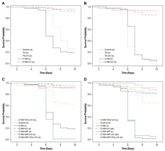 Survival curves for C. includens larvae treated with ChinNPV isolates occlusion bodies (OBs) on soybean leaf disks. (A,B) Isolates CNPSo-168 (C169) and Tabatinga (Tb) isolates exposed or not to UV-C radiation for (A) 5 min or (B) 2.5 min. (C,D) C168 isolate associated or not with UV blockers (WP, wettable powder = kaolin and TiO2 = titanium dioxide) and exposed or not to UV-C radiation for (C) 5 min or (D) 2.5 min (D). No virus-related mortality was observed in the control group, and asymptomatic deaths did not exceed 12%. Survival curves within all assays differed significantly among treatments (log-rank test, p < 0.001). Letters in parentheses indicate significant differences between treatments.